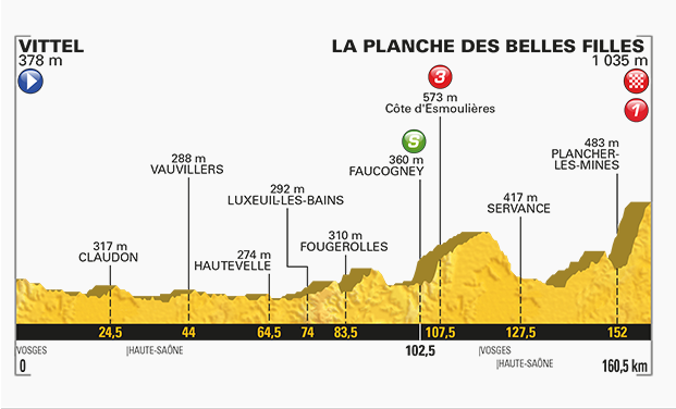 Quest’oggi il Tour de France ha vissuto la sua seconda volata, ma domani è già tempo di salite, con una tappa che dovrebbe privare Geraint Thomas della maglia gialla e vedere i primi distacchi tra i big: si parte da Vittel per arrivare, dopo 160.5km, sulla salita della Planche des Belles Filles. Una salita che verrà introdotta da una tappa sostanzialmente piatta (nel carnet solo un GPM di terza categoria, che non farà selezione), e questo potrebbe sfavorire questi scalatori che soffrono le salite secche, come Froome: anche perchè la montée di Planche des Belles Filles è dura e secca. 5km all’8.4% di pendenza media, con punte al 20% e un finale che spiana, anche se il tratto centrale è durissimo, con uno-due km fissi al 12-13%. Ci sarà da divertirsi dunque, e gli scalatori dovranno superare il primo banco di prova importante nella lunga strada verso gli Champs Elysées.
