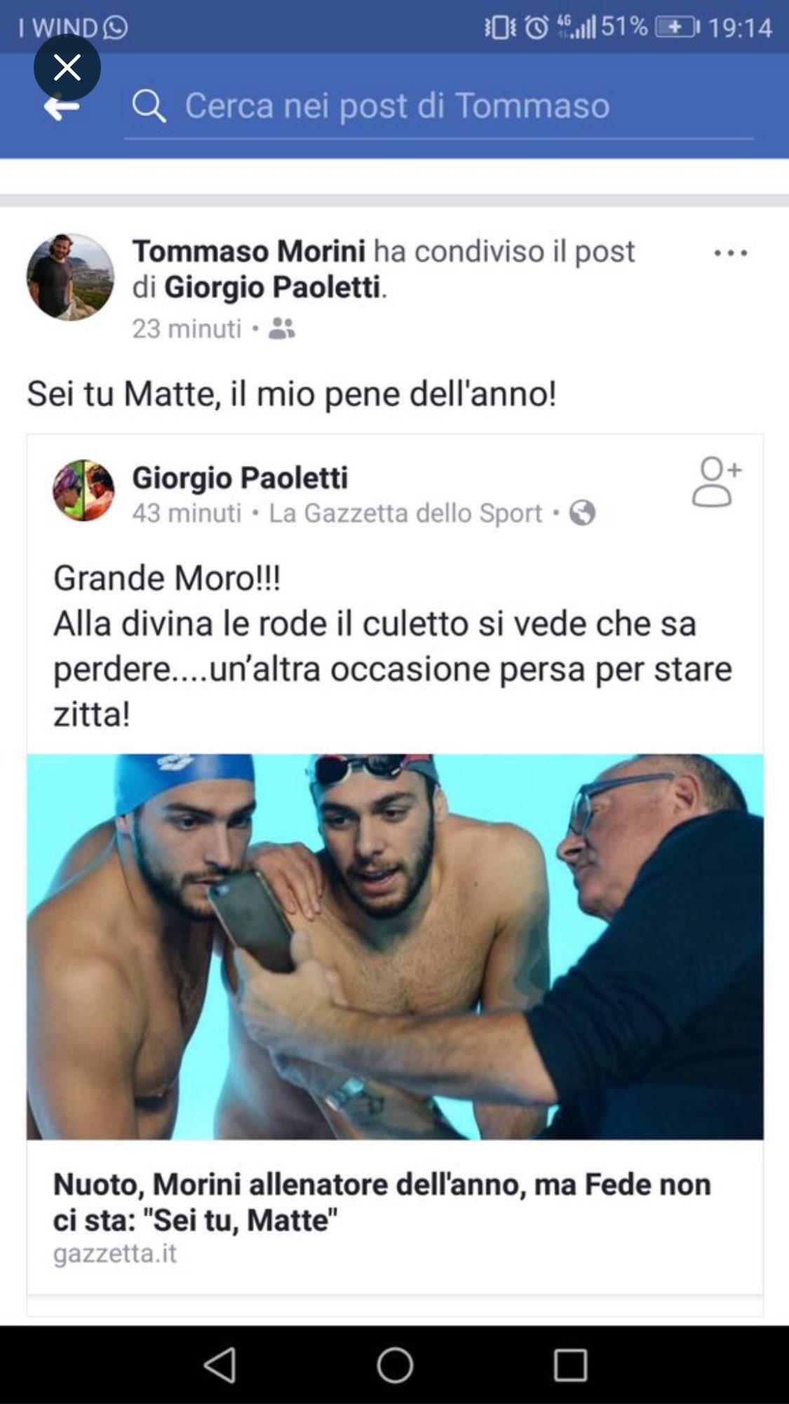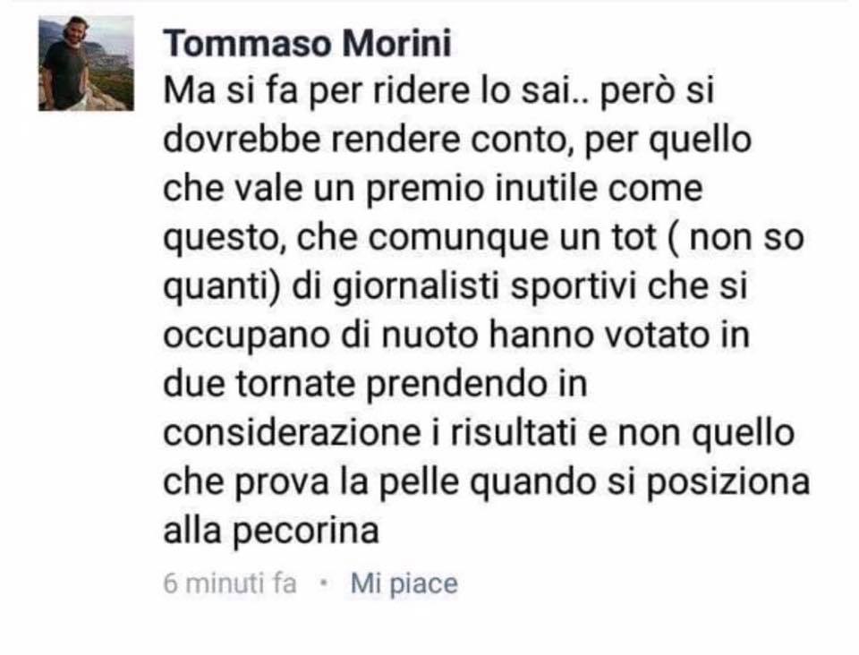 Caso ridimensionato dunque, e la figura uscita allo scoperto quest’oggi è quella di Tommaso Morini, figlio del tecnico e cugino di Detti, che è la vera e autentica causa scatenante delle sfuriate social di Federica Pellegrini: Morini jr ha fatto accuse sessiste a Federica, sfoderando le peggiori pulsioni del maschio medio e scusandosi solo dopo essere stato messo alla berlina pubblicamente dalla Pellegrini stessa attraverso alcune rivelazioni a una nota esperta di gossip e figura del mondo dello spettacolo. Sono accuse pesanti, quelle che potete vedere negli screen sottostanti, e a questo punto la querela minacciata da Federica Pellegrini e alcune delle frasi scritte ieri dalla Divina diventano giustificabili, anche se il rischio di rottura con Paltrinieri è stato serio, concreto e assolutamente evitabile.